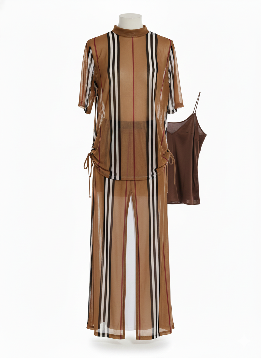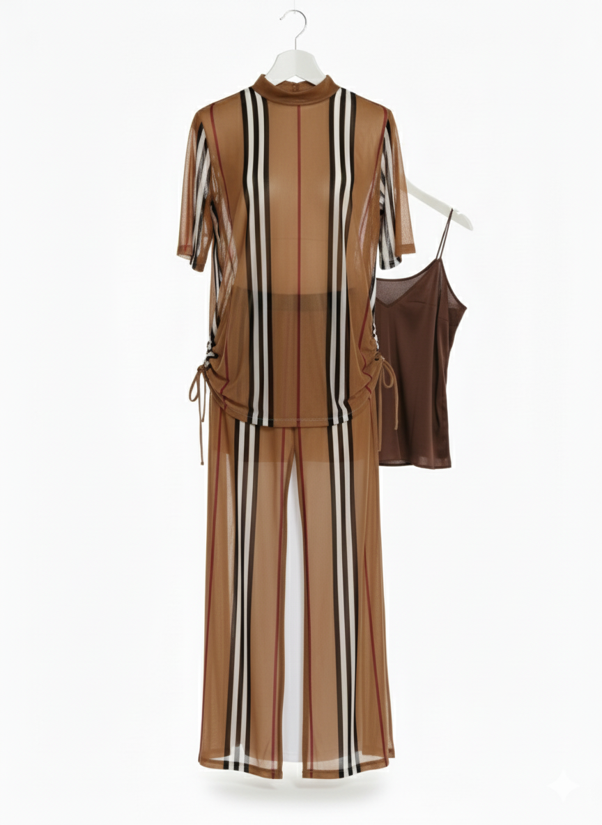 This stylish tailored 2-piece set features a Burberry-inspired striped mesh design with a matching inner slip. Perfect for a classy, comfortable, and effortlessly chic look. ✨