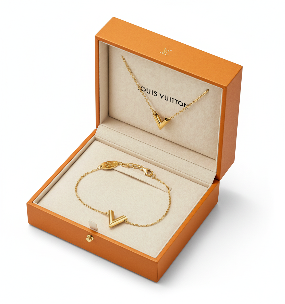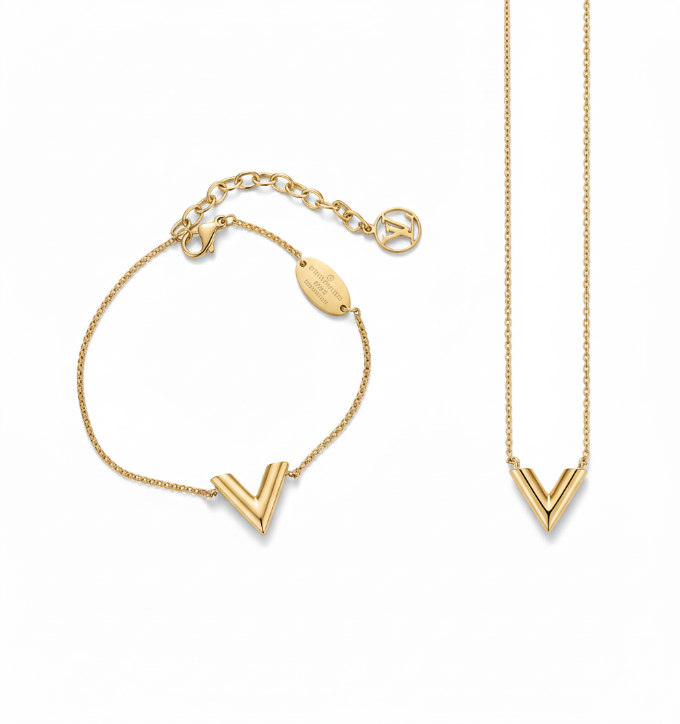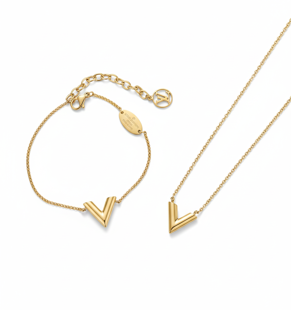 A high quality tarnish free stainless steel LV set of necklace and it's matching bracelet